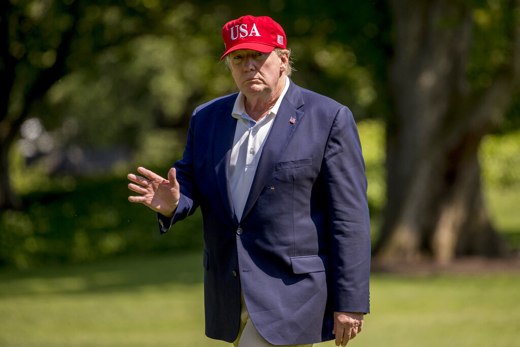 President Donald Trump arrives to the South Lawn of the White House in Washington, Sunday, June 23, 2019, after traveling from Trump National Golf Club in Sterling, Va. (AP Photo/Andrew Harnik)