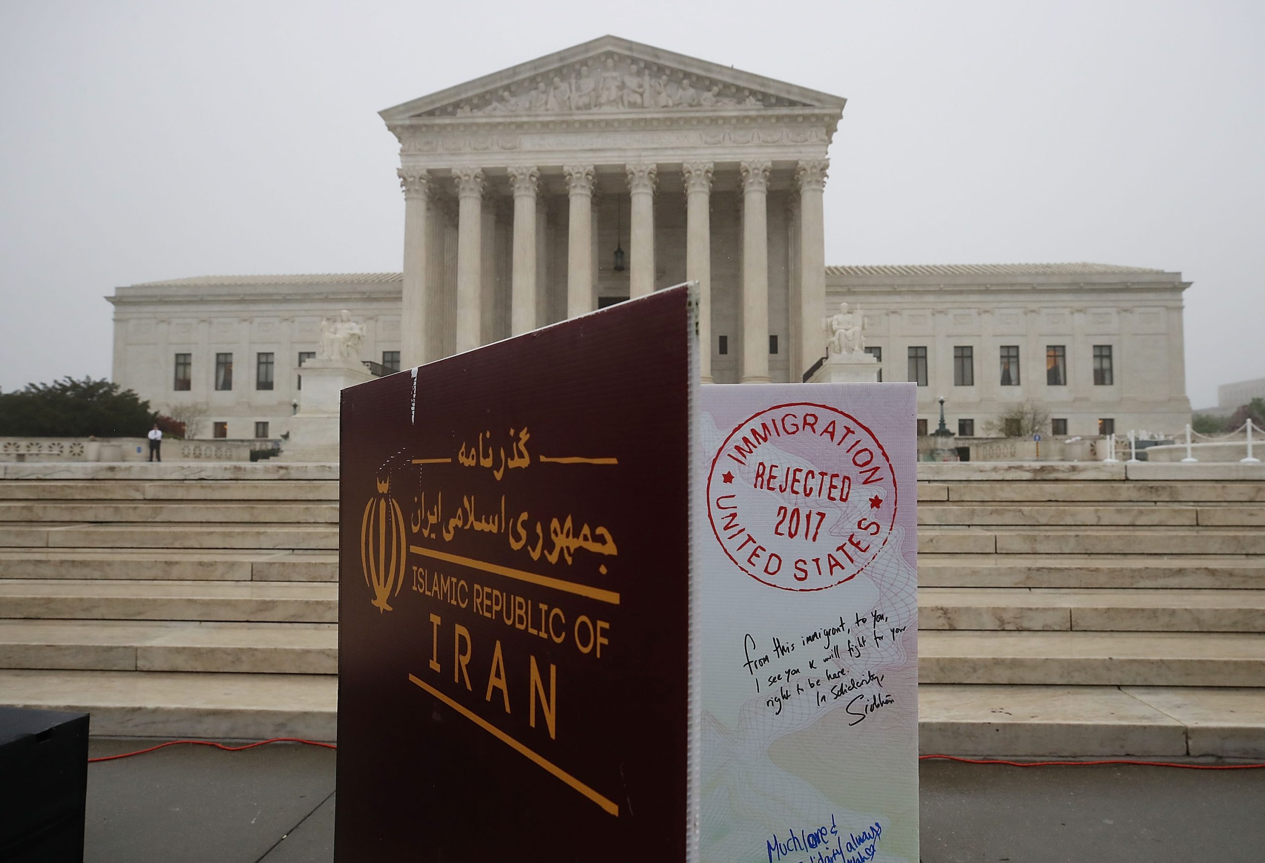 WASHINGTON, DC - APRIL 25: A simulated Iranian passport stands at a protest of President Trump's travel ban in front of the U.S. Supreme Court, on April 25, 2018 in Washington, DC. Today the high court is hearing arguments in the legal challenge of Hawaii v. Trump. (Photo by Mark Wilson/Getty Images)