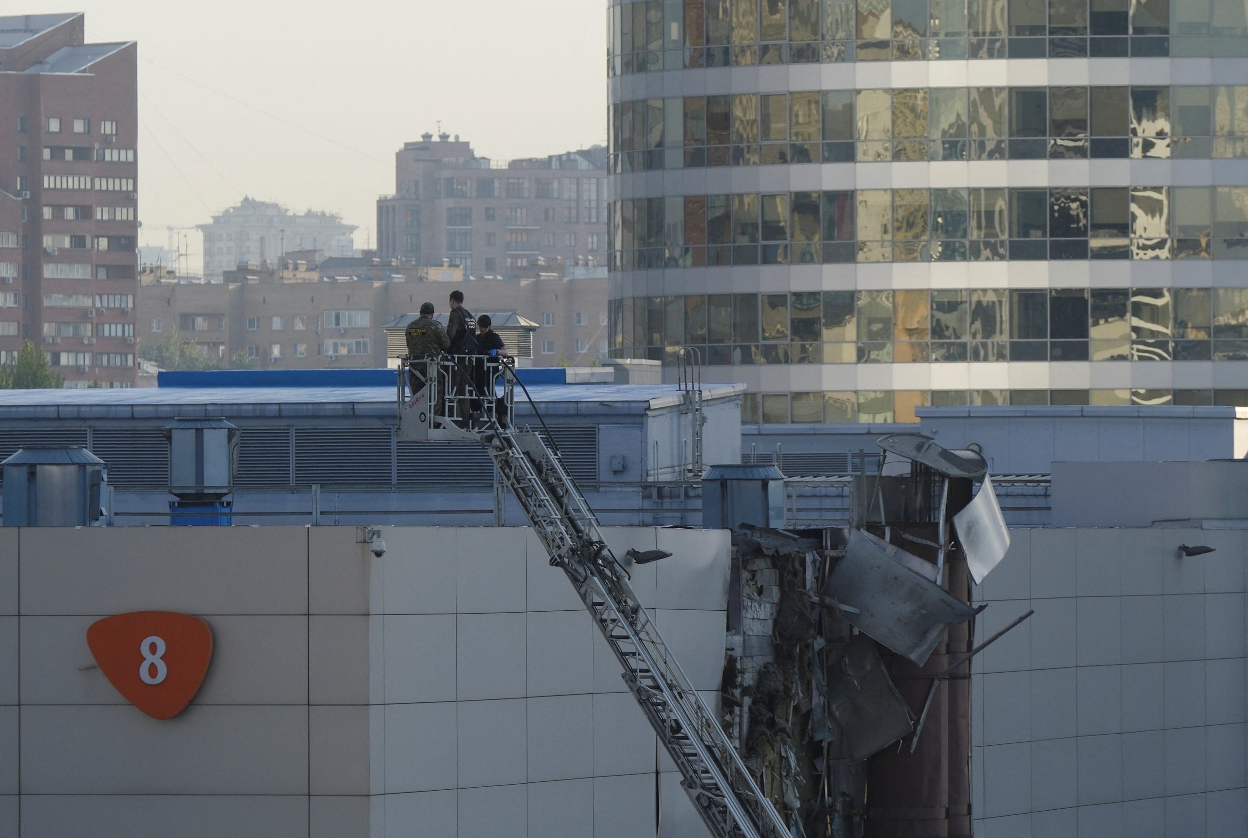Investigators work near a damaged roof following a reported Ukrainian drone shot down in Moscow, Russia, August 18, 2023. REUTERS/Shamil Zhumatov